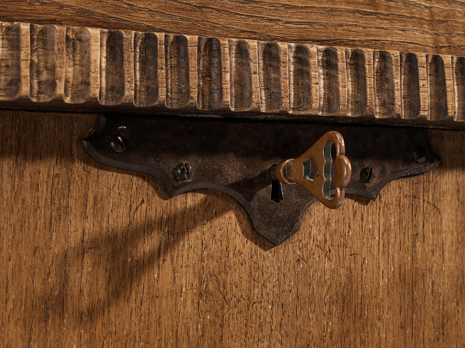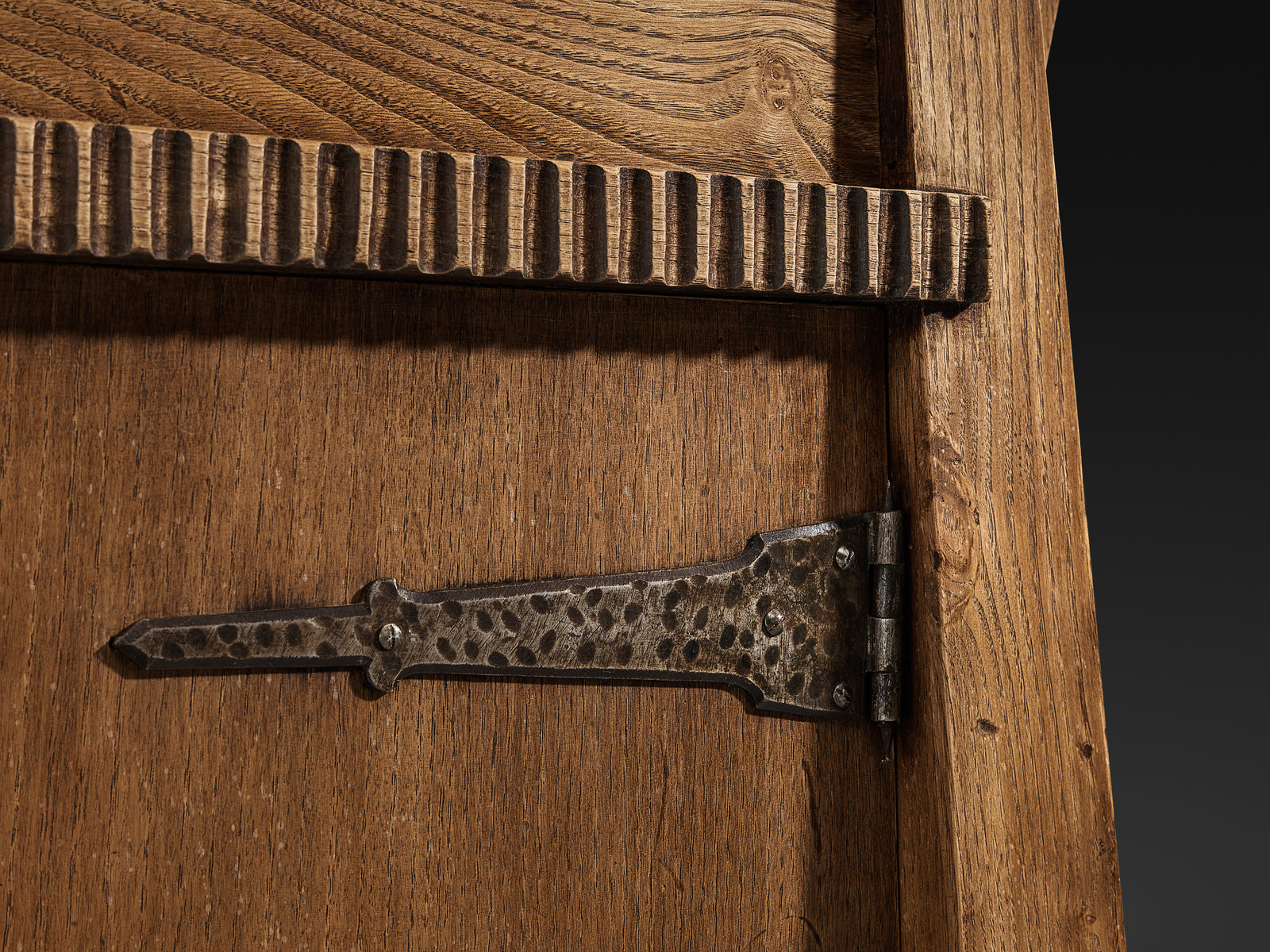 Ernesto Valabrega sideboard, metal and oak, Italy, 1930s. A striking design by Ernesto Valabrega (1901–1944), known for his handcrafted, high-quality furniture. The trapezoid form is accentuated by embossed sides, pointed iron details, hammered metal connections, and finely carved oak panels, all hallmarks of Valabrega’s craftsmanship. Son of Vittorio Valabrega, Ernesto redefined the family business in the 1920s, embracing Arts and Crafts ideals. In good, used condition with minor scratches, water spots on top, and a small chip on one leg.
