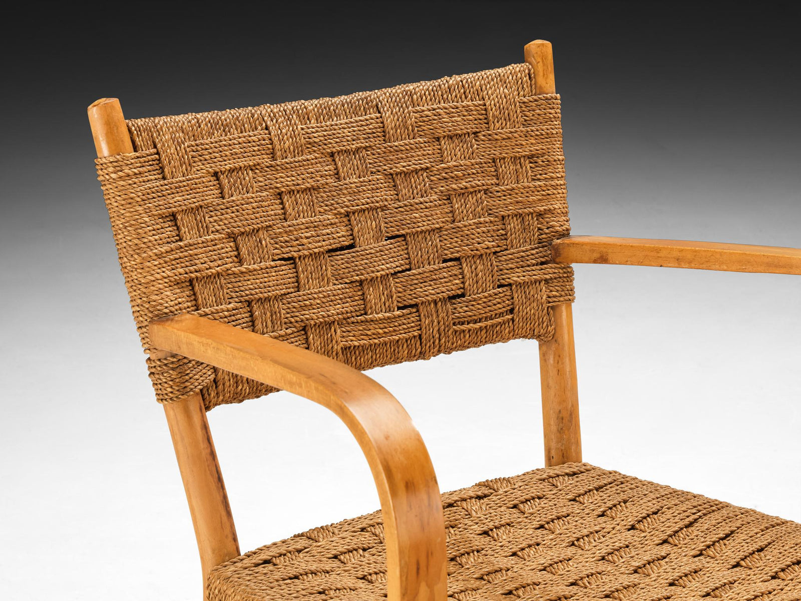 Set of four armchairs, beech and braided straw, Italy, circa 1950. Crafted from natural materials, these chairs feature curved frames and streamlined lines, reflecting rustic Italian design of the period. The set is in good, used condition with visible signs of age, including scratches and wear to the beech frame. The braided straw seats show use, and restoration may be advised depending on preference. Additional chairs are available. Please contact our team for details. VAT applies within the EU on purchases and deliveries.