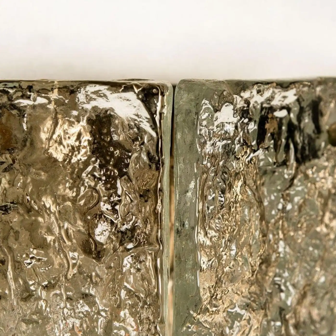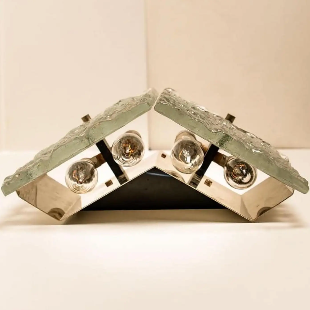 Pair of wall lamps by J. T. Kalmar, model: Karlstein, Vienna, circa 1960. With 2 relief-like crystal glasses (dispersion glass). With a nickel plated back plate. In full working order.