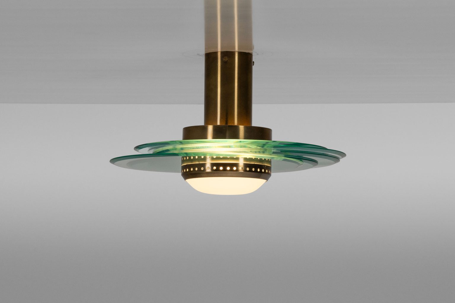 Max Ingrand for Fontana Arte, pair of ceiling lamps, model 2079, Italy, circa 1960. Each lamp comprises a gold-oxidized brass structure supporting five asymmetrically overlapping crystal glass rings, centered by a tubular fixture with white milk glass diffuser and perforated metal ring. The design produces a sculptural interplay of light across the glass edges, exemplifying Fontana Arte’s craftsmanship in glass and metal. One lamp has a minor flea-bite chip; otherwise both remain in very good condition. Sold individually. Literature: Fontana Arte catalogue, ca. 1960.