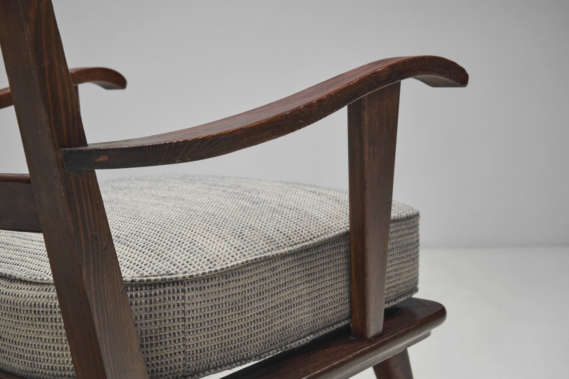 Price category: 7,500–10,000 USD / EUR. Pair of mid-century pinewood armchairs embodying the modernist principle of “form follows function.” The solid stained pine frames are architectural in precision, with tapered, splayed legs and subtly curved armrests that widen for comfort. Plush removable cushions in light textured upholstery contrast elegantly with the richly colored wood, creating a warm, functional, and sculptural design. Recently reupholstered in premium fabric, with prior restorations to the armrests. In good vintage condition with wear consistent with age. Dimensions: 66.5 × 70 × 79 cm; seat H 42.5 cm; seat depth 59 cm; arm H 60 cm (26.2" × 27.6" × 31.1").