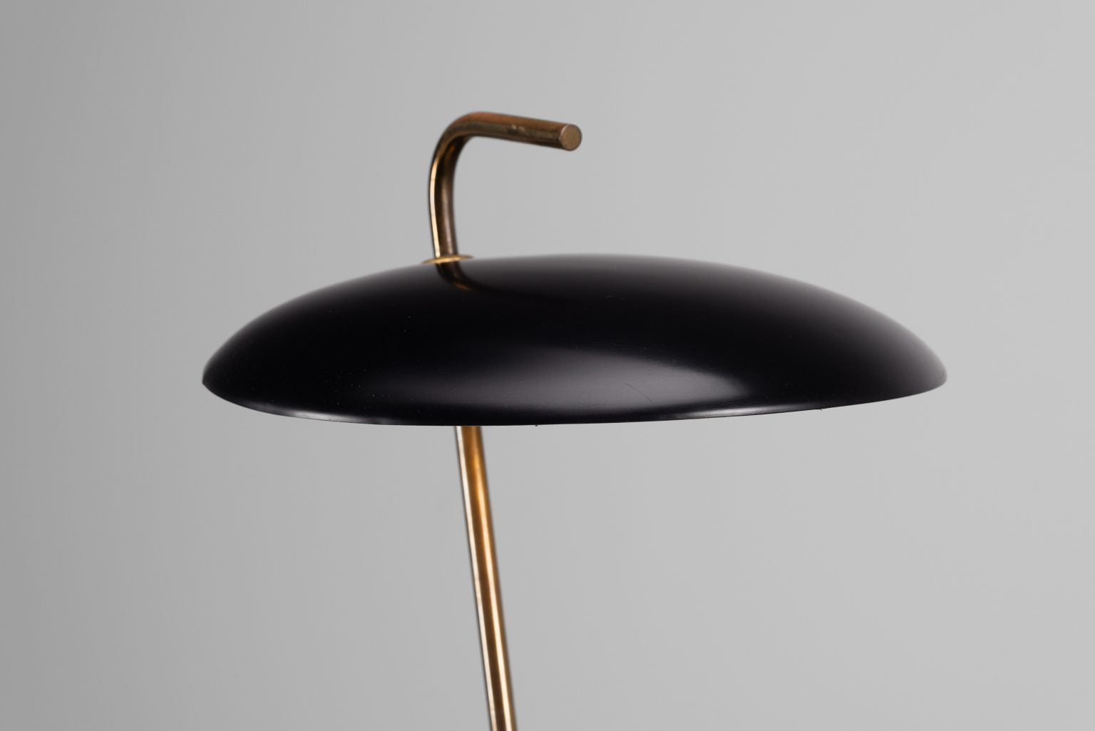 Stilnovo, table lamp, model 5120, Italy, circa 1950. Rare mid-century Italian lamp with a round white marble base, polished brass stem, and black-painted aluminum shade. The stem extends through the shade with a distinctive bent section, serving both functional and decorative purposes. The use of contrasting materials reflects Stilnovo’s modernist approach of the 1950s. In very good original condition with patina consistent with age.