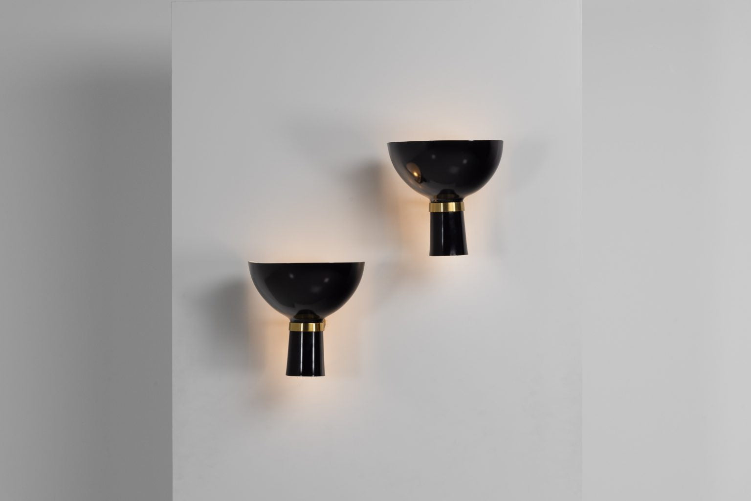 Stilnovo wall lamps, brass and aluminum, Italy, 1950s. Pair of wall lamps with brass arms and rounded wall plates supporting bowl-shaped aluminum shades, refinished in their original deep black. The shades can be adjusted to direct light upward or downward, creating a soft ambient glow. Exemplifying mid-century Italian lighting, the design combines clean lines, functional versatility, and refined materials.