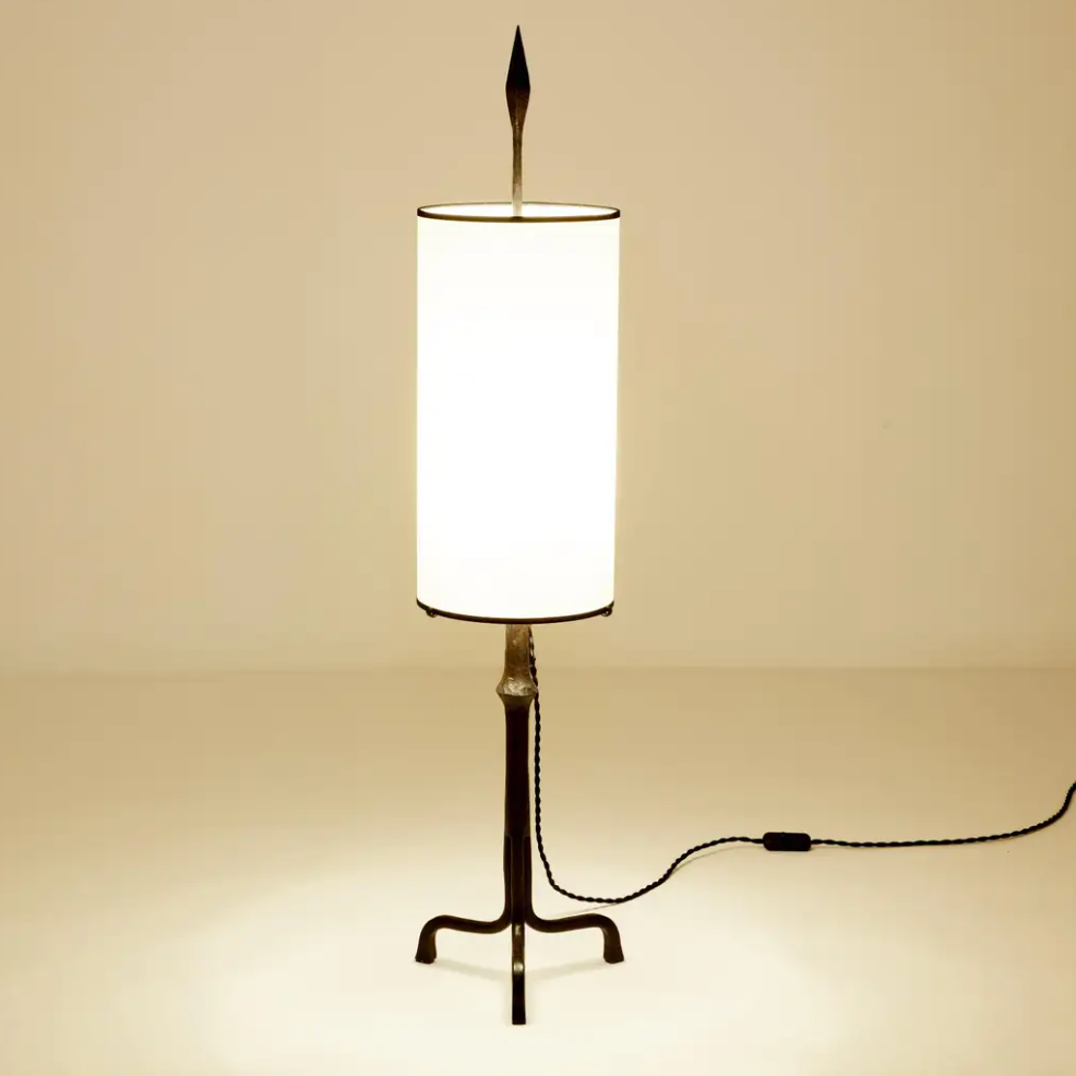 Its minimalist form features a clean-lined base and a cylindrical shade resting lightly on three iron prongs, with a spear-like finial adding a sculptural touch.